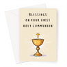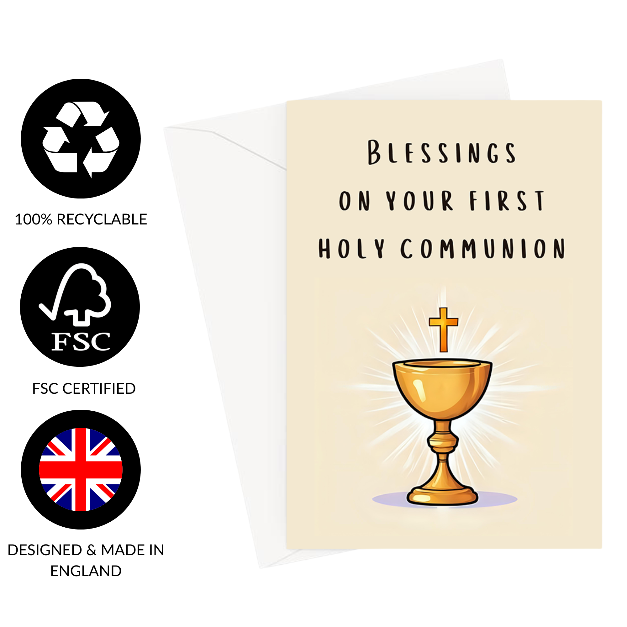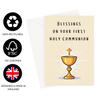 Illustrated with a classic modern design of chalice and cross and the words: Blessings on your First Holy Communion.