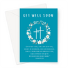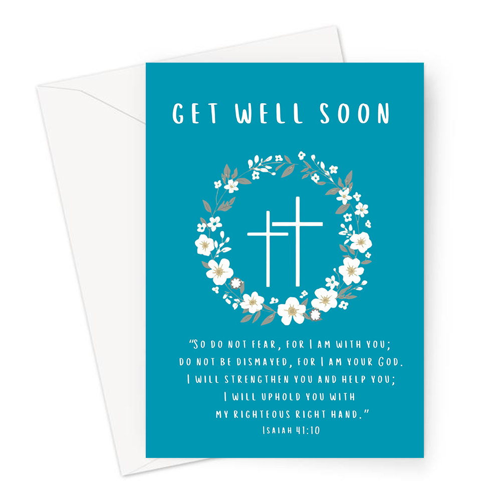 Illustrated with a floral wreath and crucifixes and the words: Get Well Soon and the powerful bible verse Isaiah 41:10.