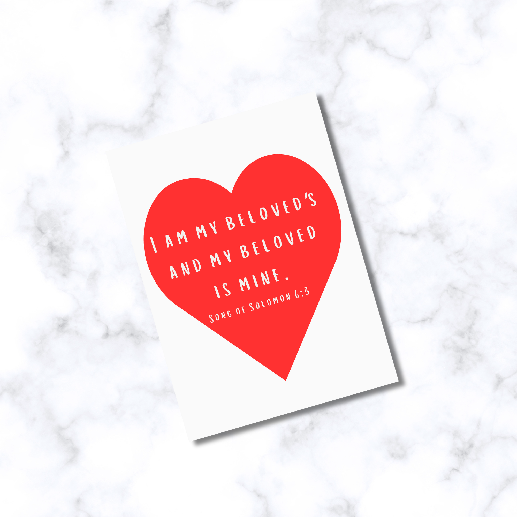 A classic card for Valentine's Day or an Anniversary or simply to let your husband or wife know how loved they are. Illustrated with a red love heart and the words: I am my beloved's and my beloved is mine. Song of Solomon 6:3.