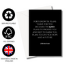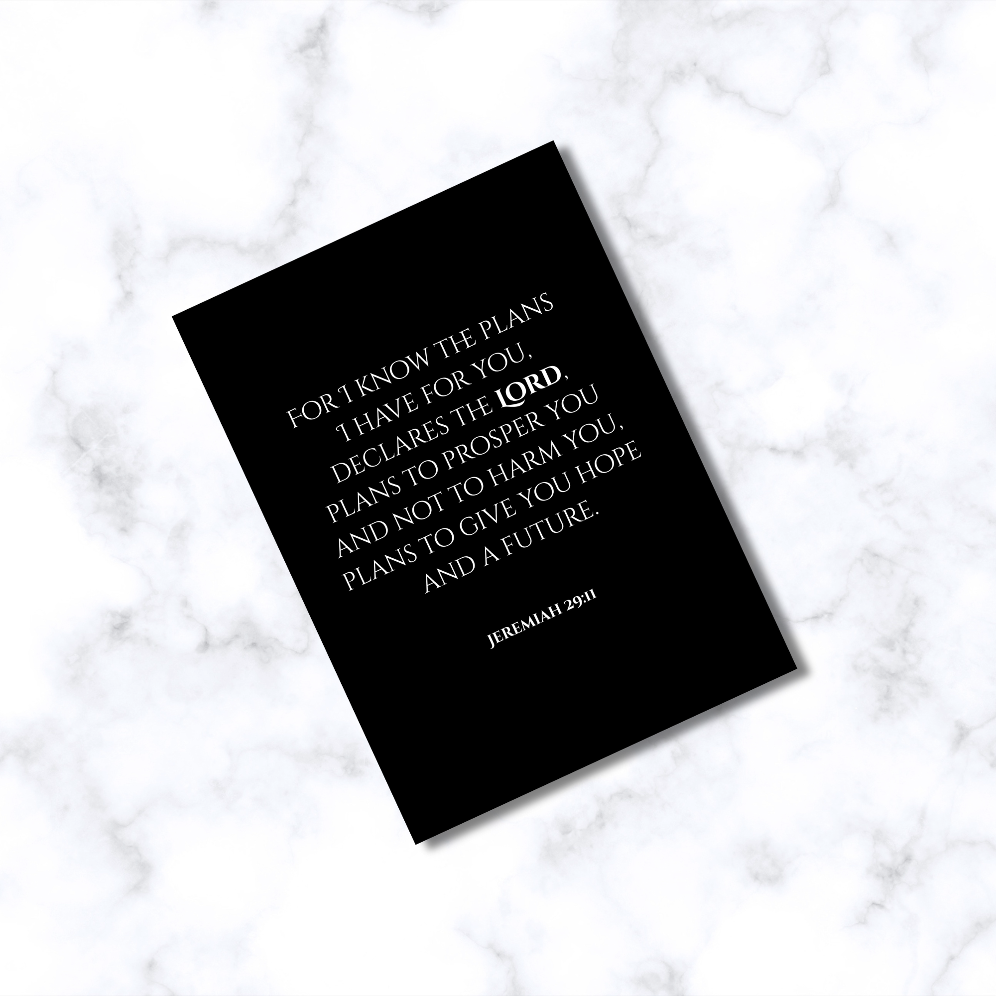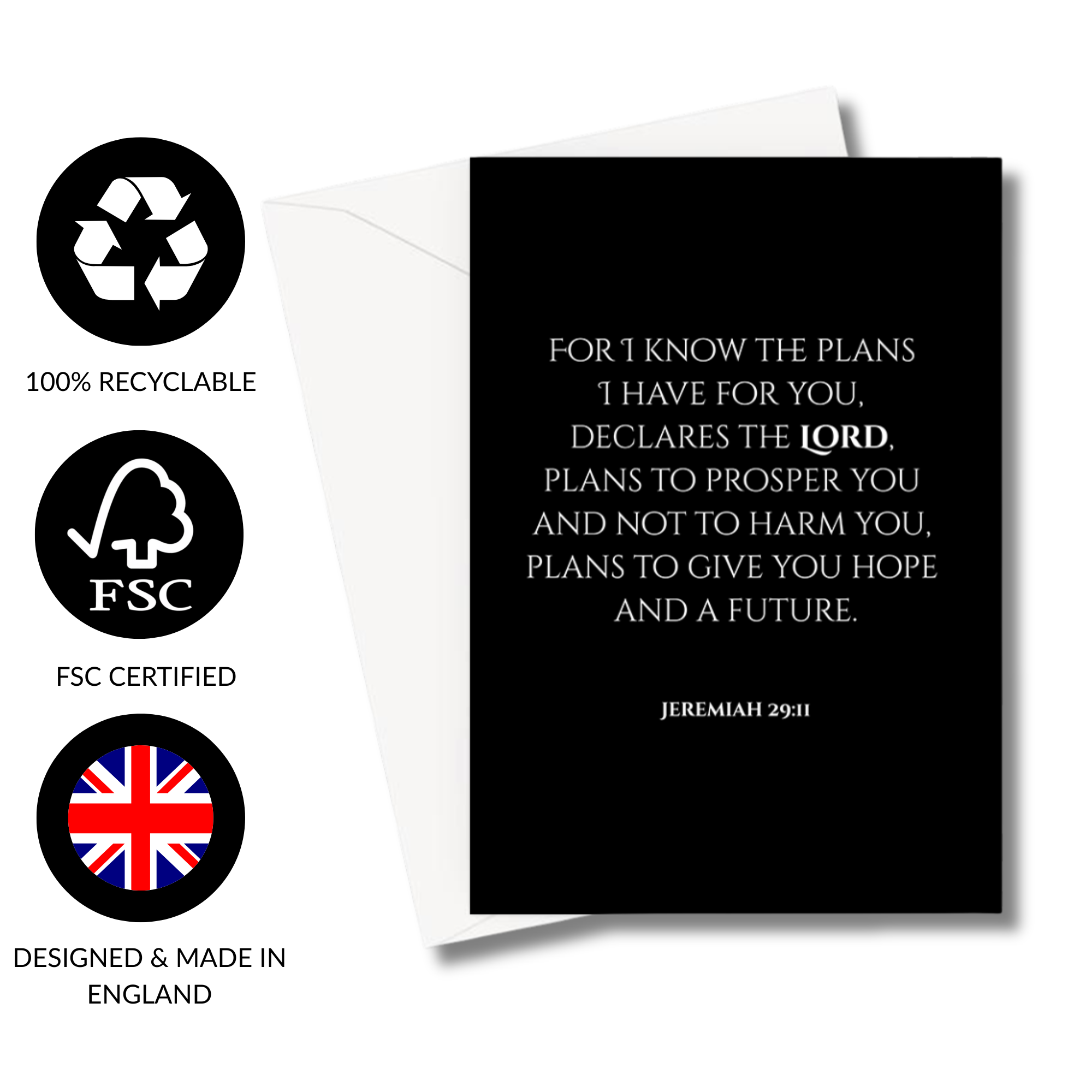 A classic black and white greeting card design with the powerful Bible verse: For I know the plans I have for you, declares the Lord, plans to prosper you and not to harm you, plans to give you hope and a future. Jeremiah 29:11.