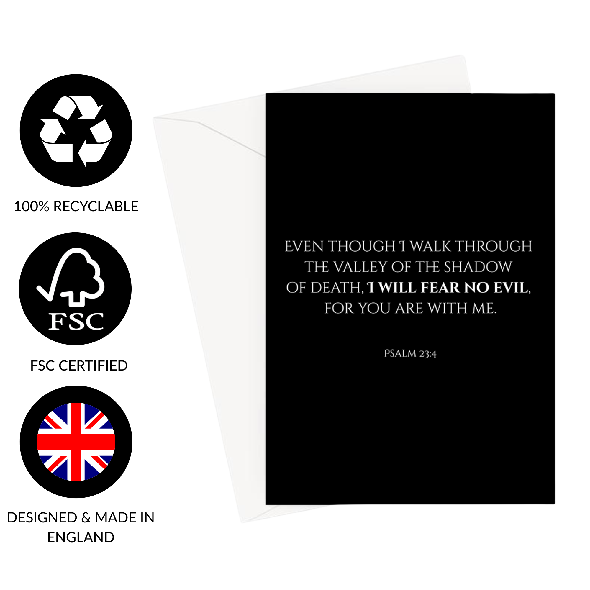 A classic black and white greeting card design with the powerful Bible verse: Even though I walk through the valley of the shadow of death, I will fear no evil, for you are with me. Psalm 23:4.