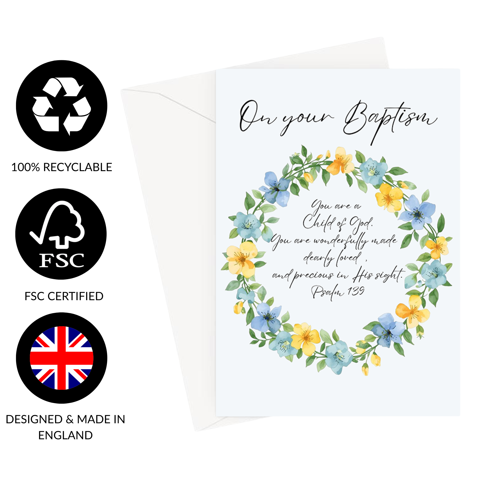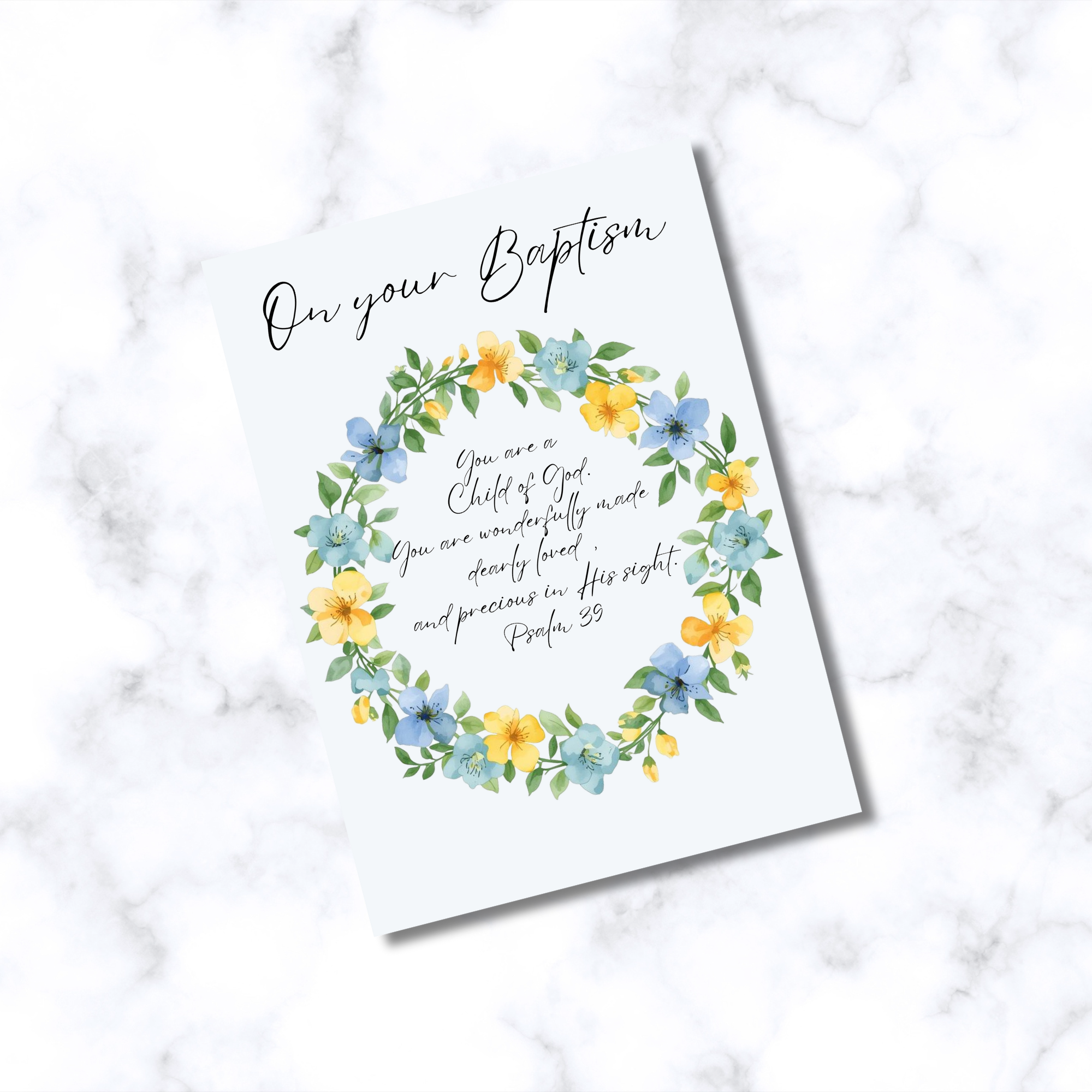 A beautiful Baptism card for a baby boy with the words: On Your Baptism, You are a child of God. You are wonderfully made, dearly loved, and precious in His sight. Psalm 139.