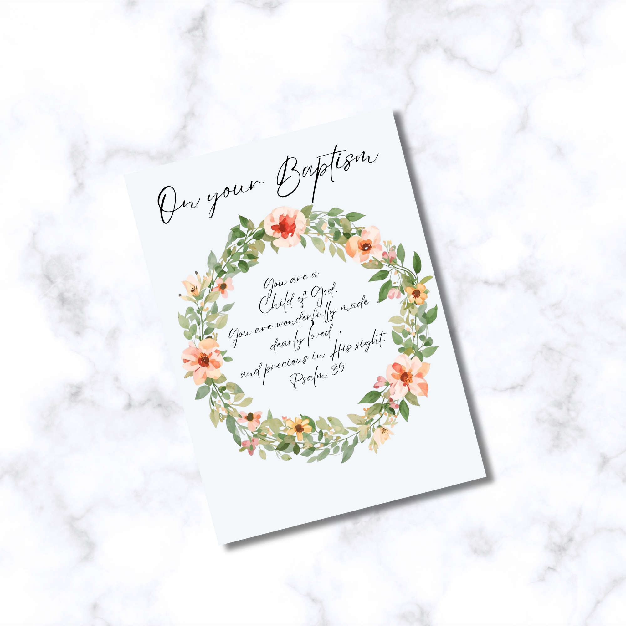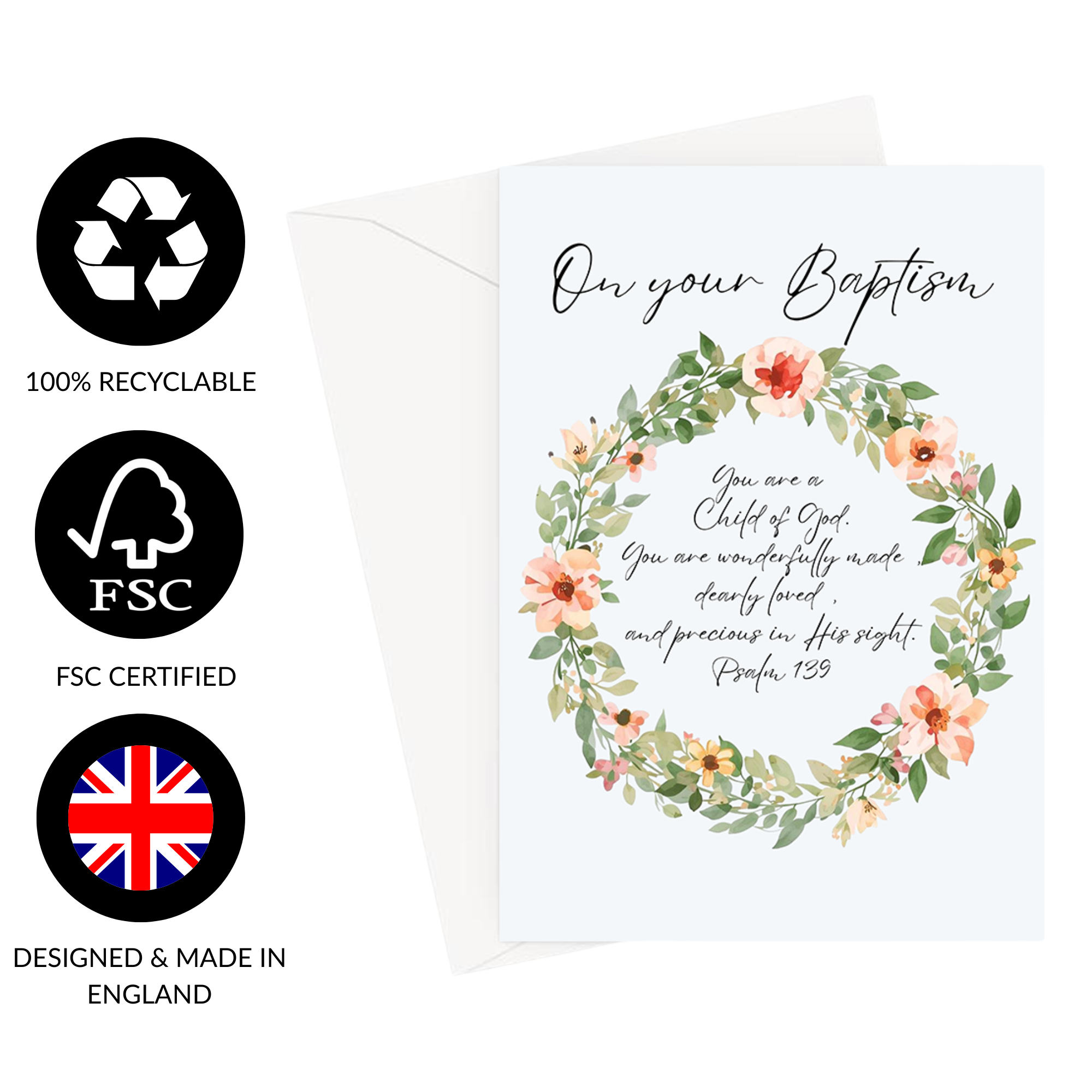 A beautiful Baptism card for a baby girl with the words: On Your Baptism, You are a child of God. You are wonderfully made, dearly loved, and precious in His sight. Psalm 139.