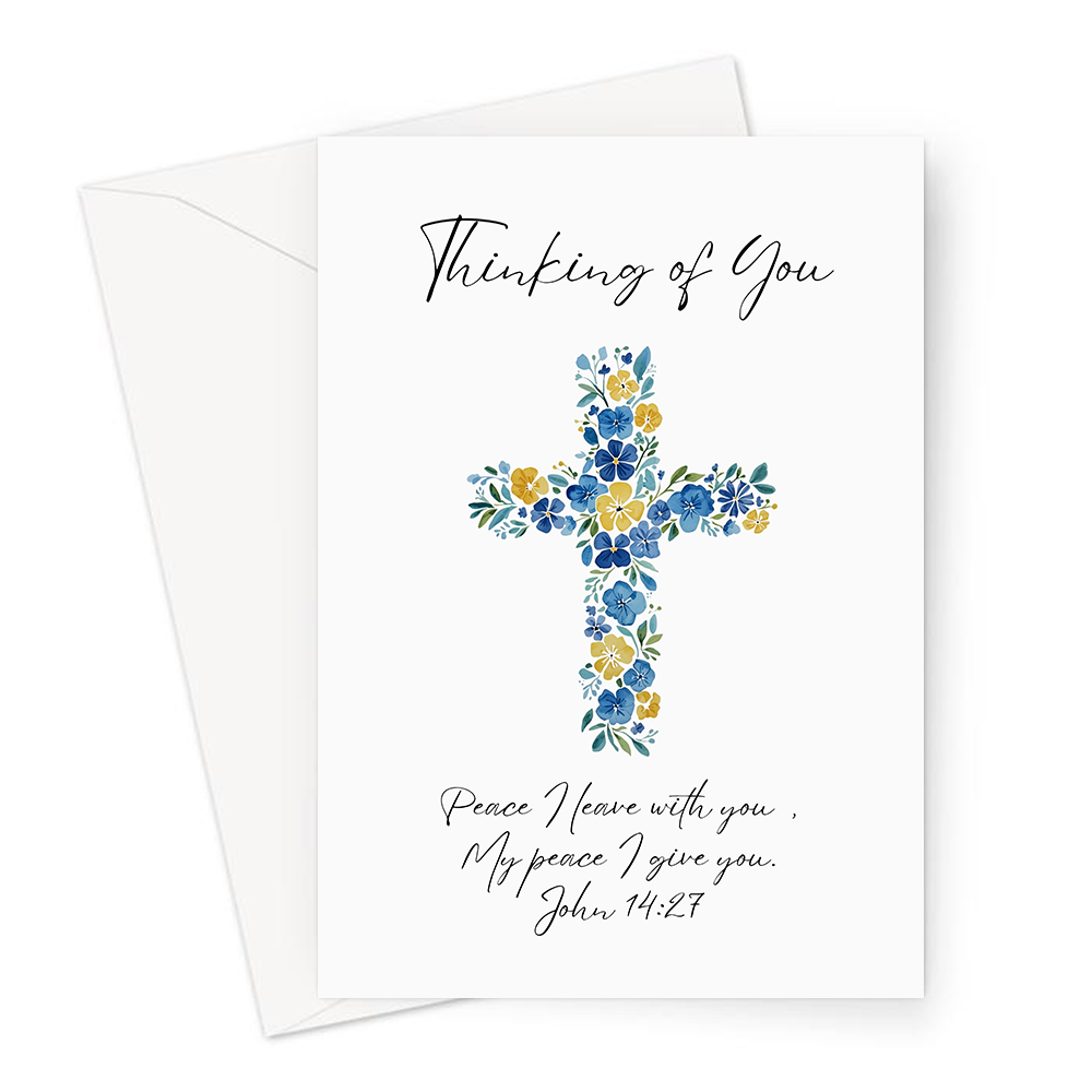 A thoughtful and meaningful greeting card to send during difficult times including illness, mourning, bereavement, divorce and hardship. With the words: Thinking of you. Peace I leave with you, my peace I give you. John 14:27.